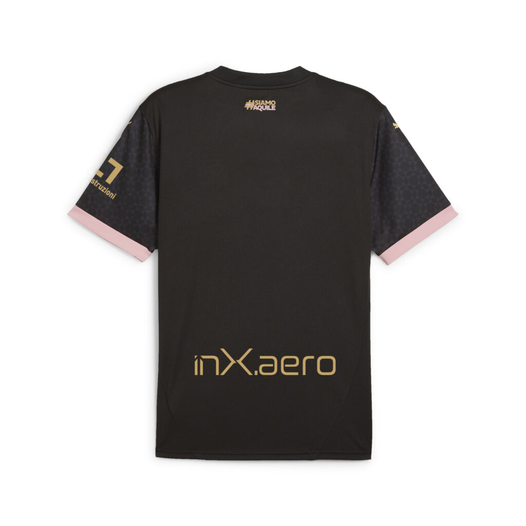PUMA and Palermo FC unveil the new Away Jersey 2024/25. The new Away Jersey is predominantly based on the Puma Black colorway enriched with Gold details and an innovative tone-on-tone geometric pattern that completely decorates the jersey, which is embellished with an elegant V-neck, the slogan on the back #siamoaquile and the sleeve borders with the contrasting Bright Pink colorway. The Jersey celebrates the colour gold, which since 1932, with the appearance of the golden Eagle on the two-coloured shield, has accompanied Pink and Black among Palermo's identity colours. Palermo FC’s new regular-fit Away Jersey combines 100% recycled polyester fabrics with PUMA’s advanced dryCELL thermoregulation technology, an improved moisture management system that ensures the perfect body temperature. Ideal for both the game and everyday wear, the jersey is made with PUMA’s innovative RE:FIBRE recycling technology and contains at least 95% recycled textile waste. The jersey is as much a fashion statement as it is an elite performance jersey.